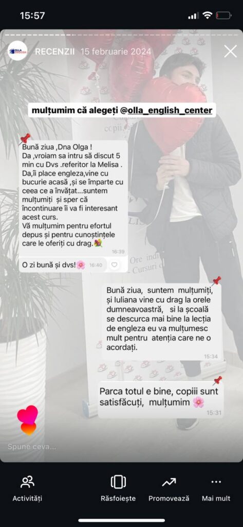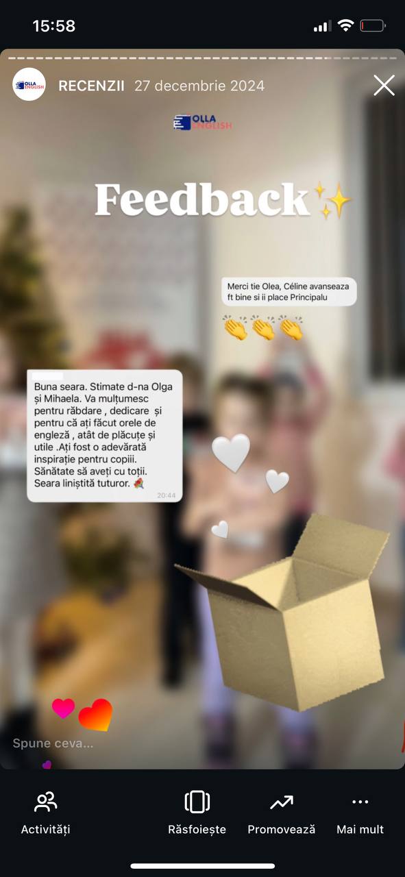 La OLLA English Center, cei mici descoperă engleza într-un mod natural, prin cântece, jocuri și povești. Cursurile sunt create special pentru preșcolari și îi ajută să-și dezvolte vocabularul, pronunția și încrederea în vorbire.